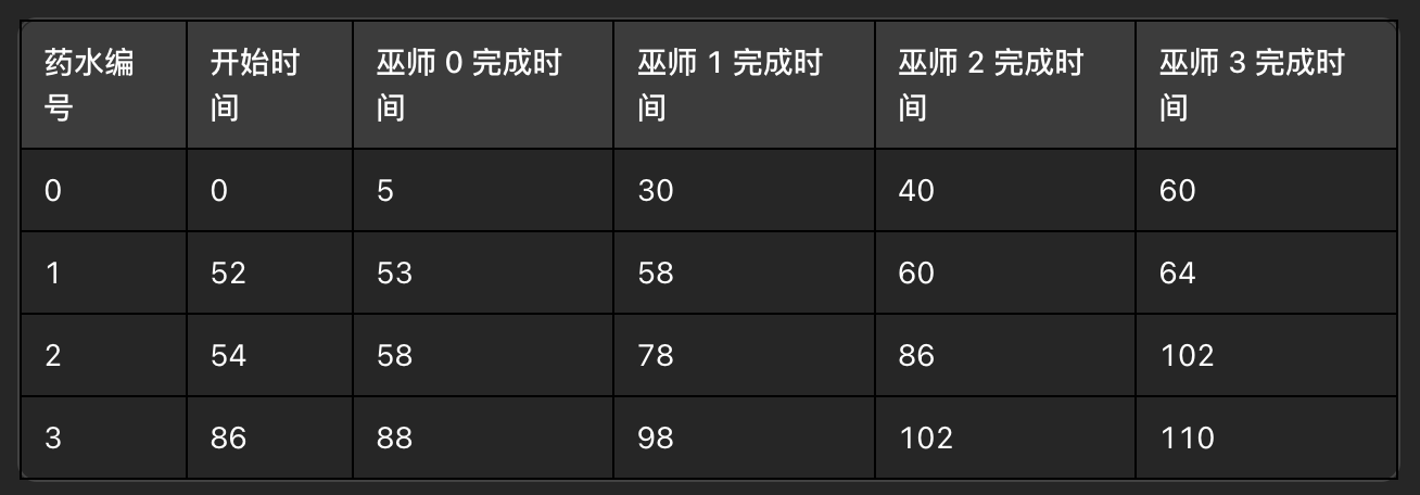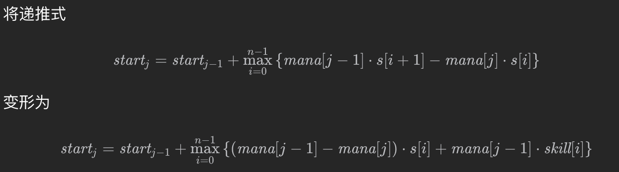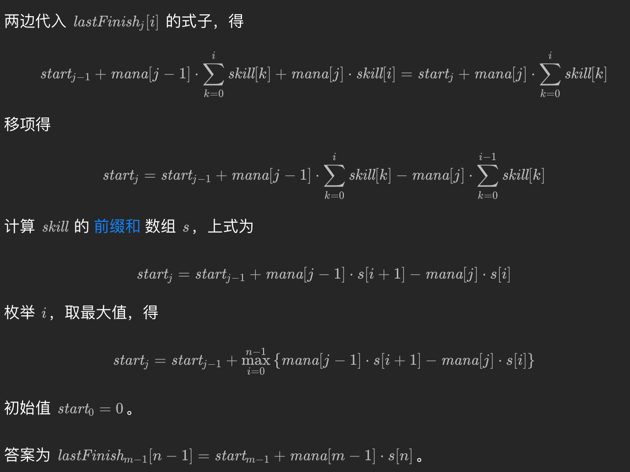 classSolution: defminTime(self, skill: List[int], mana: List[int]) -> int: n = len(skill) s = list(accumulate(skill, initial=0)) # skill 的前缀和 start = 0 for pre, cur in pairwise(mana): start += max(pre * s[i + 1] - cur * s[i] for i inrange(n)) return start + mana[-1] * s[-1]